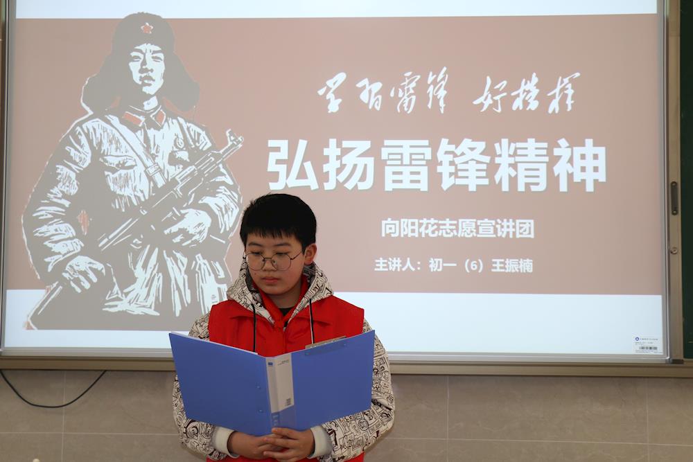 “向阳花志愿宣讲团”的小小志愿者们走进各个班级,他们用故事栩栩如生地把雷锋形象展现在少先队员的面前,并倡议同学们要和文明握手,向雷锋同志看齐,做新时代少年,在生活中乐于互帮互助,在活动中奉献能量,怀揣一份雷锋精神,更加努力学习,回馈社会,茁壮成长,做“四有”好少年。