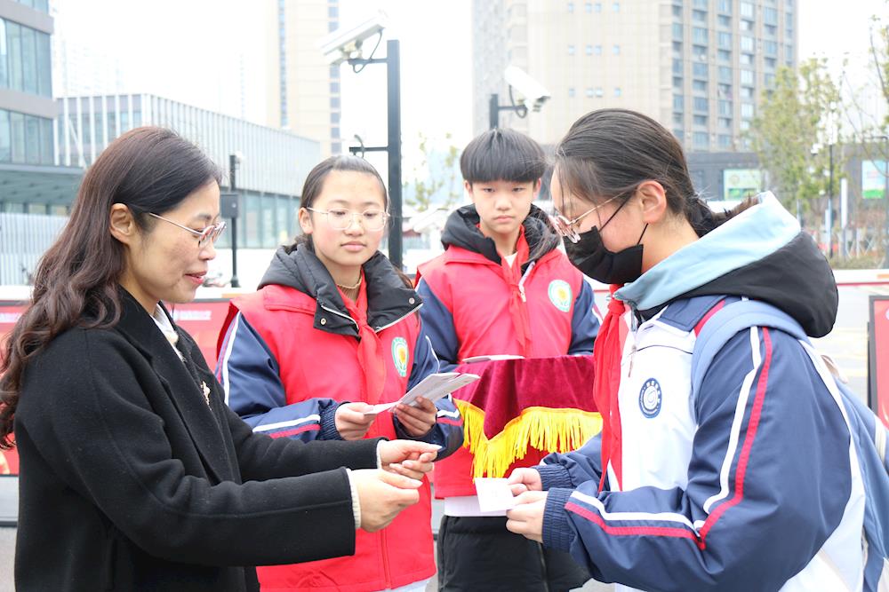 石雪珍校长早早地迎在学校门口,一边给学生们递上一份带有寄语签名的心愿卡,一边微笑着送上新学期祝福和殷切的期盼,勉励学生们做更好的自己,在新的学期继续踔厉奋发,砥砺前行。