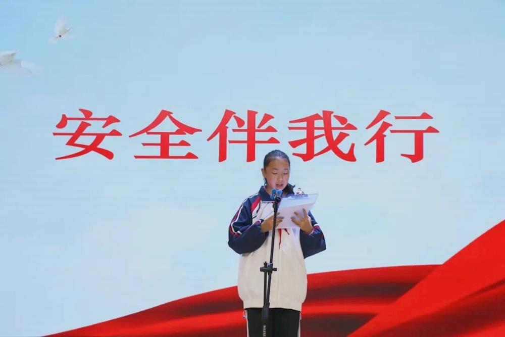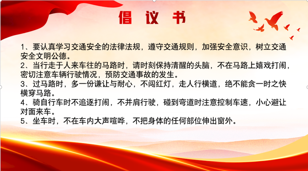 为增强交通安全意识,初一(6)班杨语彤同学在升旗仪式上发表了《安全伴我行》的演讲,并向全体师生发出倡议。