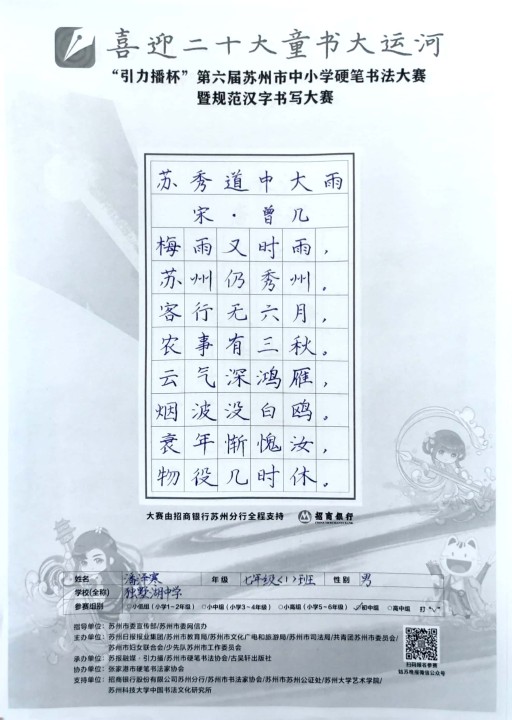 中华文化源远流长,汉字作为传承中华文化的文字载体,具有增强中华民族文化凝聚力和认同感的深远意义。我校组织25名学生参加“引力播杯”第六届苏州市中小学硬笔书法大赛暨规范汉字书法大赛的初赛。