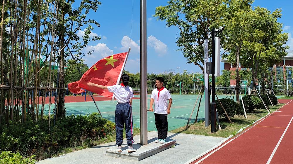鲜艳的五星红旗在雄壮激昂的国歌声中冉冉升起,全体师生行注目礼、齐唱国歌,少先队员敬队礼,庄严的升旗仪式,开启新学期的奋进之旅。