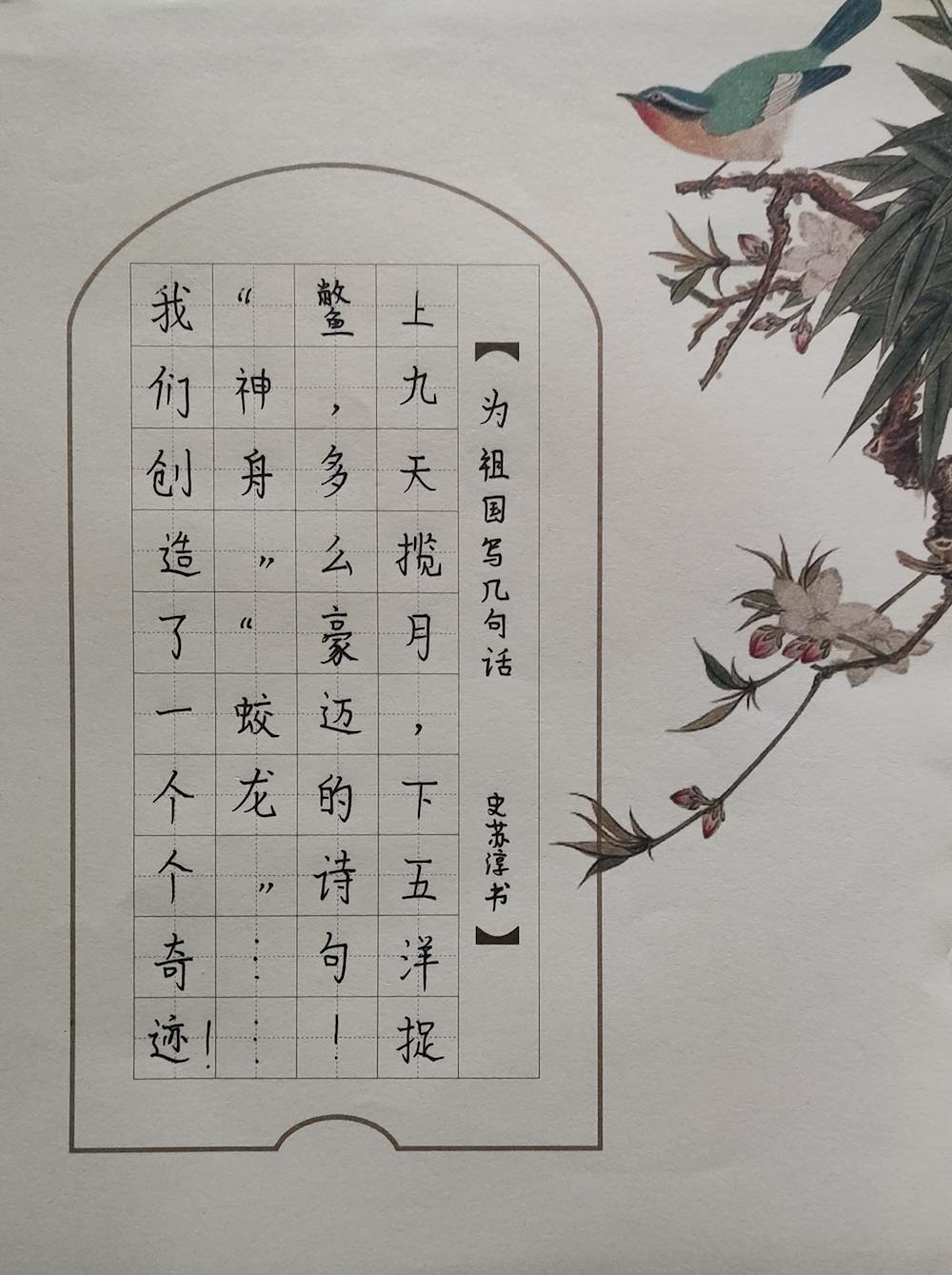 乘百舸争流之势,续中华民族之魂。墅中少年以青春之名向祖国献礼,写下对祖国的美好祝愿。一撇一捺,书写墅中学子的爱国热情;一丝一念,遥想浩浩九州的峥嵘岁月;一文一墨,勾勒神州大地的今朝辉煌。