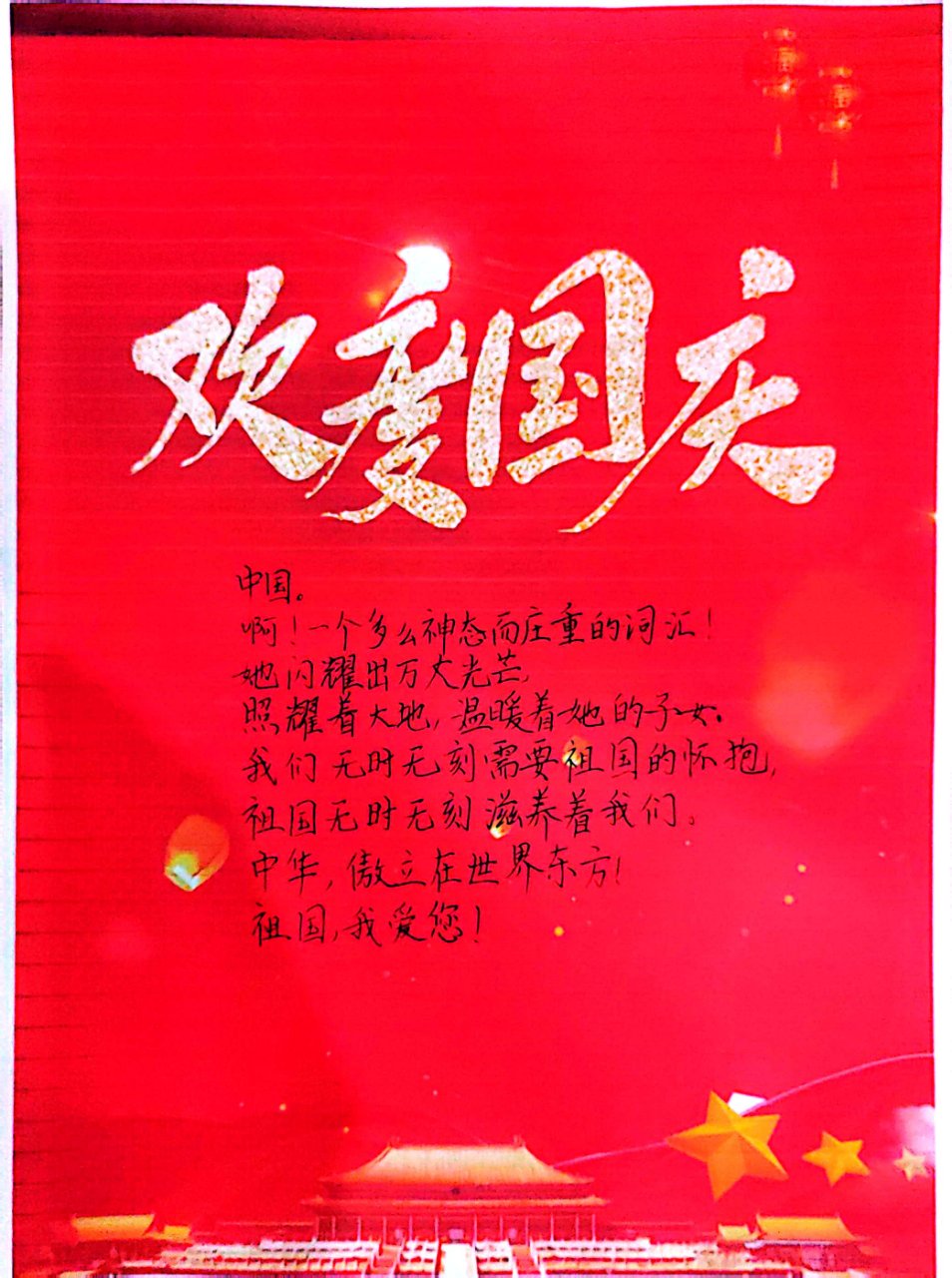 “祖国二字,让多少人心中泛起温柔的波浪,让多少人眼中涌起晶莹的泪花,让多少人胸中奔腾一股热血。”值此佳节,墅中师生通过一系列庆祝活动,礼赞祖国华诞,祝愿伟大祖国繁荣昌盛。让我们为了祖国的明天而努力奋斗,为了祖国的未来而贡献我们的力量。