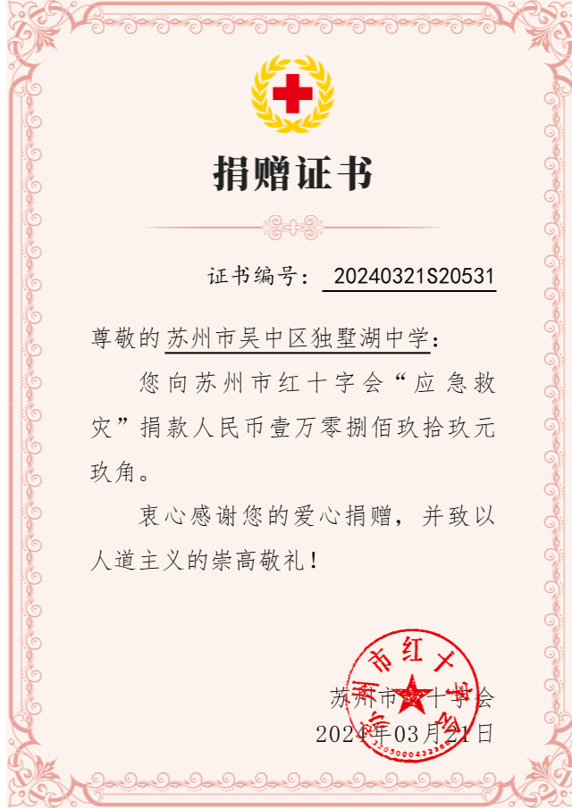 苏州市吴中区独墅湖中学3月份学雷锋义卖捐赠证书