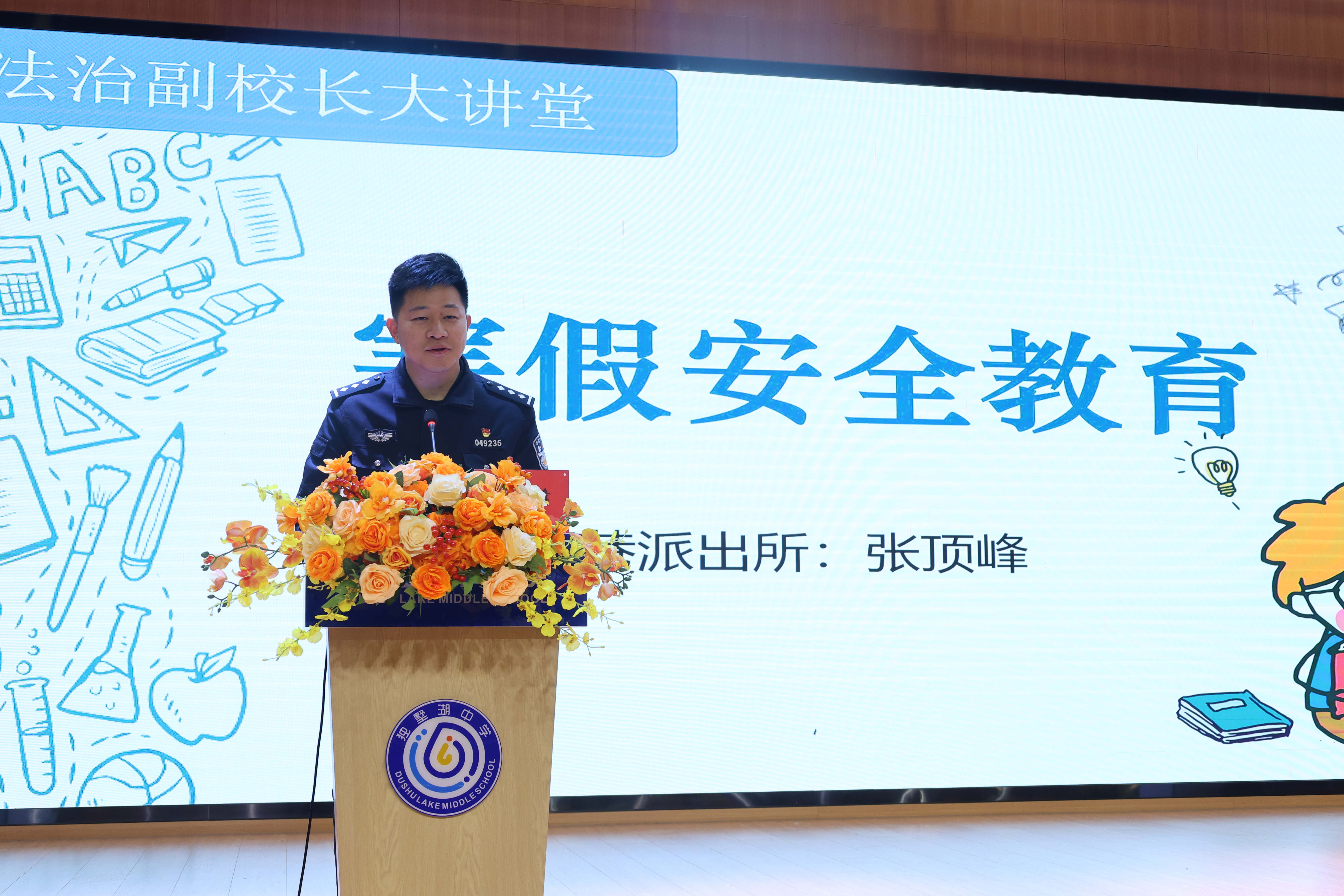 为进一步让法治安全走进校园,加强学生们的法律意识和安全意识,我校特聘郭巷派出所张顶峰所长为法治副校长,为师生上了一堂“寒假安全法治课”。安全事项不容小觑,张所长告诫同学们寒假期间要注意燃放烟花安全,出行安全、消防安全。同时,寒假上网娱乐也不可放松警惕!不沉迷虚拟世界,严控上网时长,时刻筑牢网络安全防线。