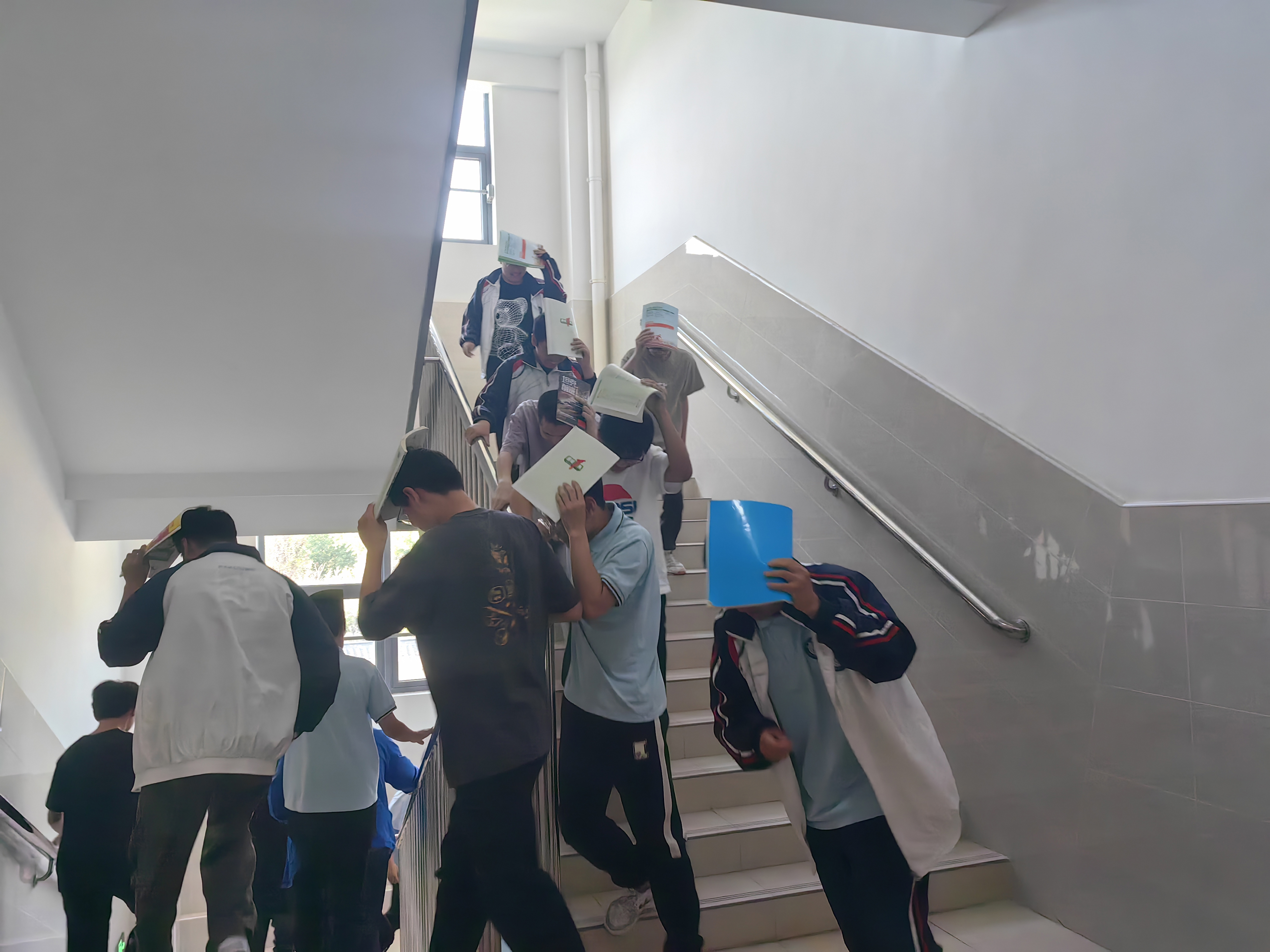 第二段警报响起,宣告着即将进入逃生阶段。各班级教师迅速组织学生,按照预定的疏散路线,有序撤离教学楼。学生们用书本或手臂护住头部,弓着腰,以最快的速度、最安静的姿态,沿着楼梯向操场安全区域跑去。在楼梯拐角、楼道口等关键位置,负责引导的老师坚守岗位,大声提醒学生注意安全,避免拥挤推搡。整个逃生过程紧张而不慌乱,仅仅3分钟15秒,全校师生便全部安全疏散至操场,完成了这场与 “时间赛跑” 的生命大转移。