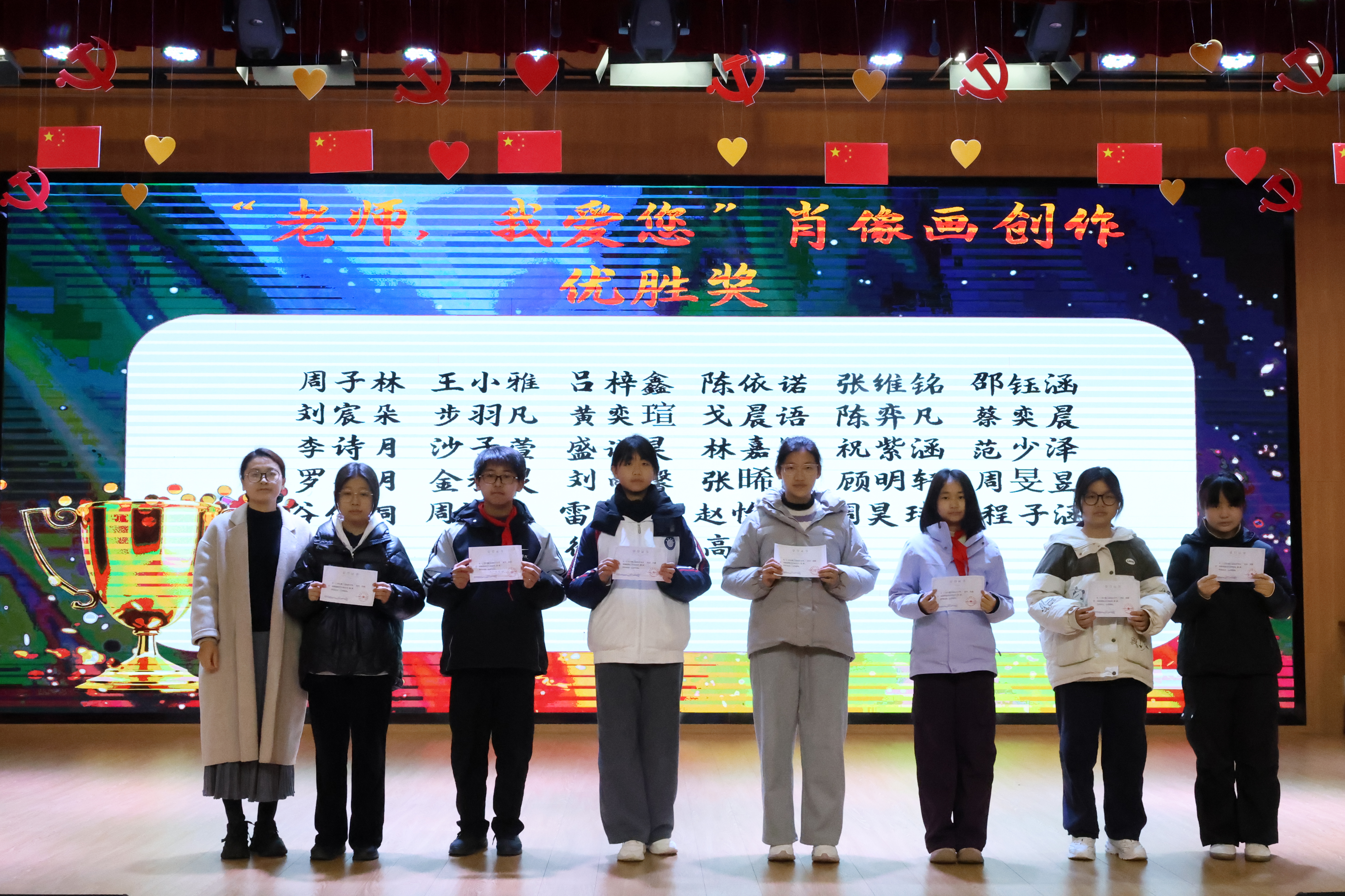 闭幕仪式在舒缓的音乐中拉开帷幕,首个环节聚焦“老师我爱您肖像画”作品回顾。现场大屏幕滚动播放着一幅幅饱含爱意的肖像画,同学们以细腻的笔触勾勒出班主任的温柔模样,以明亮的色彩定格师生间的温暖瞬间,每一笔都藏着对班主任最纯粹的敬意与喜爱。随后,我校浦晓红、王丛丛、王芳三位老师分别为肖像画比赛获奖同学颁发奖状,获奖学子们手持荣誉,笑容灿烂,这份荣誉不仅是对他们绘画才华的肯定,更是对师生温情的见证,台下掌声阵阵,暖意融融。