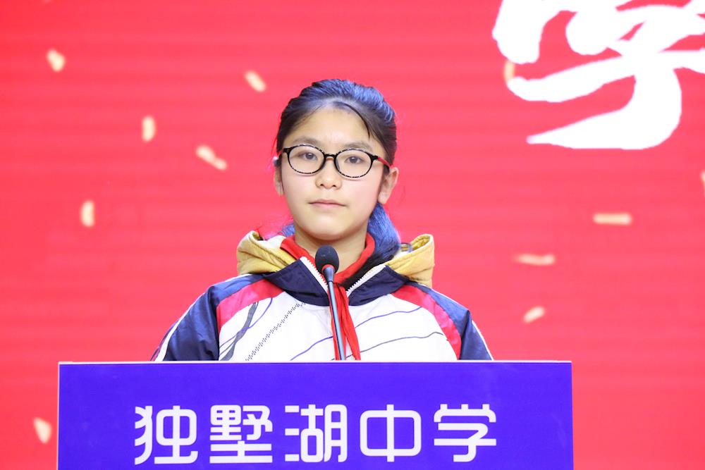 学生代表初一(1)班代云沁同学的精彩发言振奋人心,她代表全体学生郑重承诺:勇于告别过去的不足,告别自身的缺点,不断挑战自我,重塑自我。在独墅湖中学的沃土上播撒希望,用汗水浇灌,长出灿烂耀眼的骄阳,成长为有理想,有道德,有文化,守纪律的优秀青年!